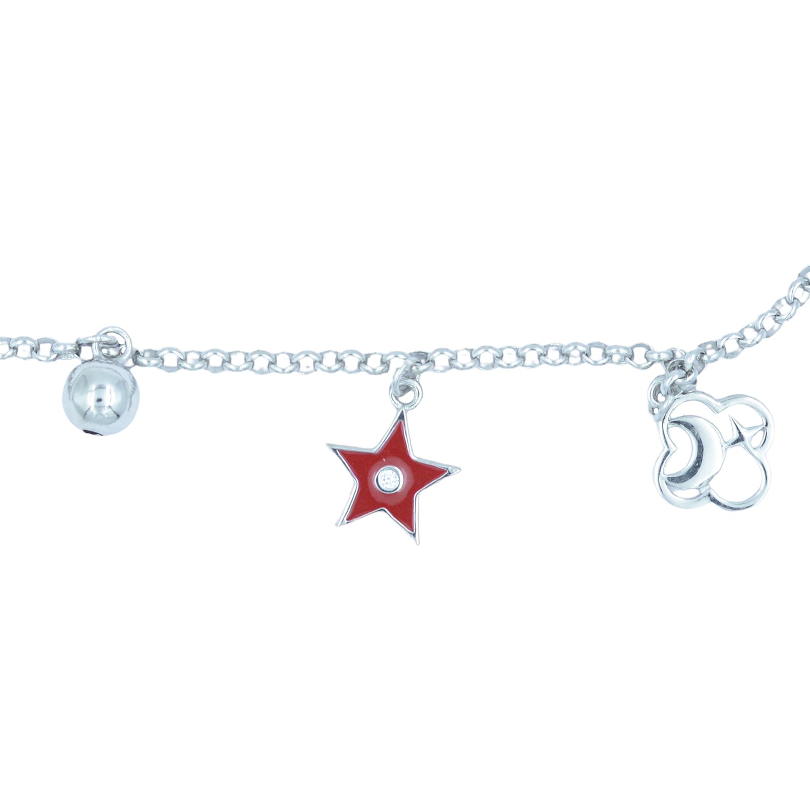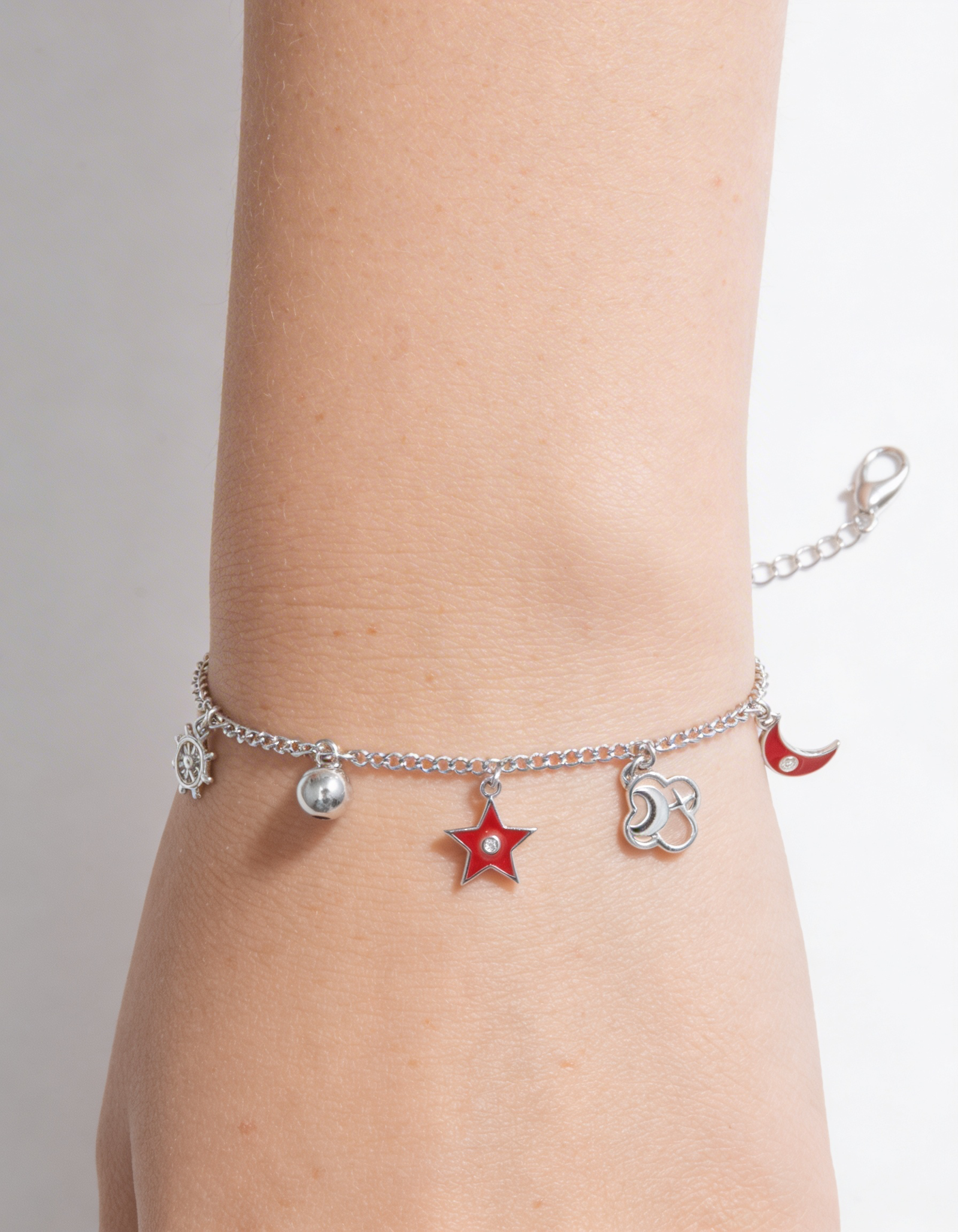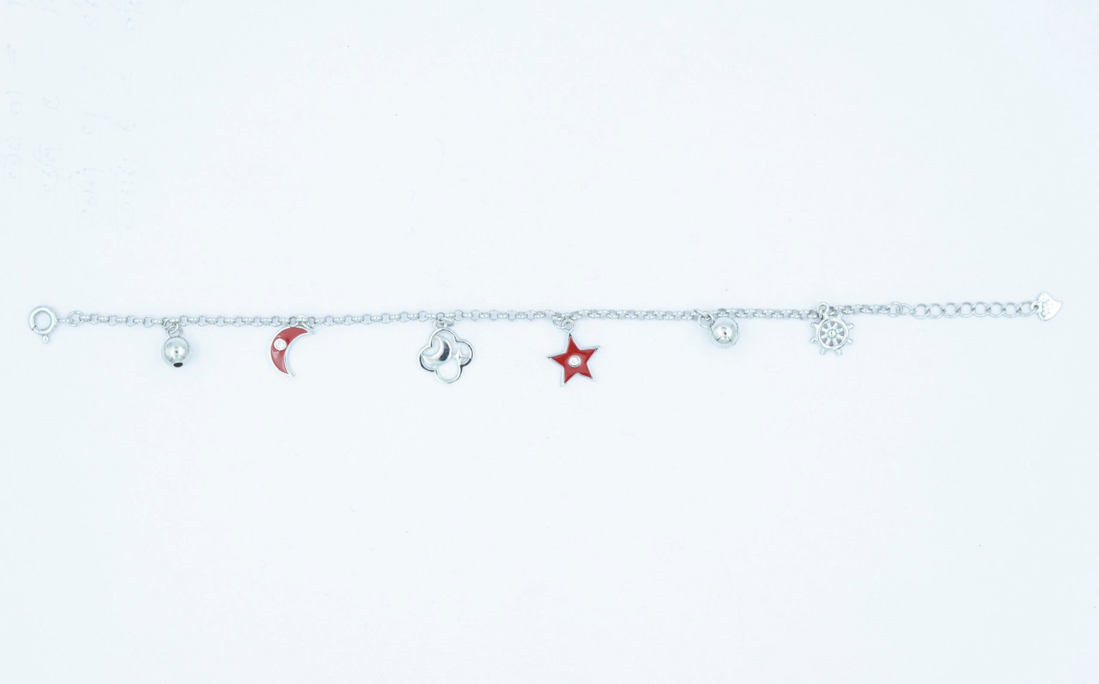 This sterling silver charm bracelet is more than jewellery—it’s a journey. Featuring symbolic accents like a ship’s wheel, star, crescent moon, and interlocked rings, each charm marks a point on your personal map. The star guides your dreams, the wheel steers your intentions, and the rings celebrate eternal bonds. Finished with glossy enamel beads and polished silver spheres, it’s a tribute to the wanderer at heart. Whether gifted or worn as a reminder of past travels or future adventures, this piece carries the essence of exploration—a keepsake for the soul in motion. RIA-BRL-13